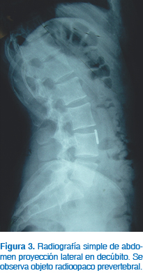 Paciente femenino de 29 años, originaria y residente del Distrito Federal, no manifestó alergias ni enfermedades crónicas. Antecedentes ginecológicos y obstétricos: menarca a 12 años, eumenorreica, inicio de vida sexual activa a los 24 años, gesta uno, cesárea uno en el 2009, como método de planificación familiar: DIU de cobre de dos años de uso, sin revisiones periódicas postinserción, sólo realización de citología cervical un año posterior a su colocación que la paciente reporta como normal. Se presenta de manera espontánea a su Unidad de Medicina Familiar para revisión de DIU y realización de citología cervical; en la especuloscopia no se aprecian las bridas del DIU. Referida a Segundo Nivel de Atención Médica. A su ingreso antecedente de colocación de DIU por vía vaginal sin complicación aparente; comenta sólo dolor cólico posterior a la inserción cediendo a analgésicos vía oral no especificados, sin sintomatología hasta la fecha, negando dismenorrea, sangrado uterino anormal, cervicovaginitis. A la exploración física: presión arterial de 100/70 mmHg, frecuencia cardiaca de 72 latidos/minuto, frecuencia respiratoria 16 respiraciones/minuto, temperatura 36 °C. Mucosas bien hidratadas, tórax simétrico, campos pulmonares ventilados y sin agregados, ruidos cardiacos rítmicos de adecuada intensidad, abdomen simétrico, con ruidos peristálticos presentes, normales en frecuencia e intensidad, blando, depresible, sin hiperestesia o hiperbaralgesia, sin dolor a la palpación media o profunda, sin masas o megalias. Signos negativos: descompresión, apendiculares, Dunphy y Jobert; maniobra de Tarral negativa. Se realiza radiografía simple de abdomen y valoración bajo fluoroscopio con hallazgo de DIU previamente colocado de forma intencionada por el Servicio de Ginecología, como testigo, así como imagen radiopaca de dispositivo migrado en cuadrante superior derecho que modifica su posición con la movilización de la paciente (Figuras 1 a 3).