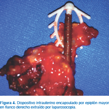 Valorada por el Servicio de Cirugía General, con el diagnóstico de DIU translocado de colocación en cuadrante superior derecho de dos años de evolución sin datos de abdomen agudo. Por el tiempo de evolución, la presentación asintomática y por no contar con datos clínicos de complicación o urgencia, se programa electivamente cirugía laparoscópica, la cual se realiza sin complicaciones, con hallazgo de DIU encapsulado por adherencias firmes y laxas a omento mayor, de las cuales se liberó con electrocauterio y disección cortante (Figura 4).