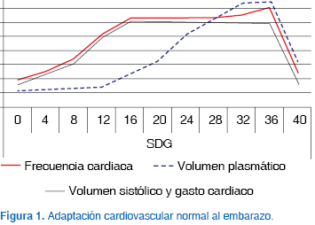 El volumen sistólico aumenta de manera temprana en el embarazo y luego disminuye hasta niveles pregrávidos en el último trimestre. Incrementos en los estrógenos plasmáticos con la consecuente estimulación en receptores miocárdicos alfa resultan con aumentos de frecuencia cardiaca de 10 a 20 latidos por minuto, causando por este mecanismo un incremento en el gasto cardiaco desde las semanas 8 a 10 de gestación, con picos en las semanas 25 a 304,7-10 (Figura 1). El crecimiento auricular y el aumento de estrógeno en el embarazo disminuyen el umbral para las arritmias.7 Por otro lado, el volumen de los eritrocitos aumenta en el embarazo de término hasta en un 18%. Este aumento es menor en magnitud que el aumento en el volumen plasmático y genera la llamada anemia fisiológica del embarazo, con valores de hematócrito entre 30-33% para el final del embarazo.8,9,11
