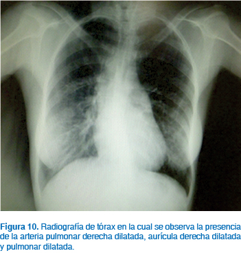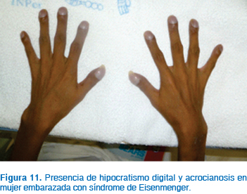 El síndrome de Eisenmenger es la complicación más crítica de las pacientes que presentan algún tipo de defecto cardiaco con cortocircuito13,18,22 (Figuras 9 a 11). Este síndrome se desarrolla a través de los años conforme se incrementa el grado y severidad de la hipertensión pulmonar cuando no existe corrección del defecto inicial. La causa más común para la aparición del síndrome es un gran defecto septal seguido de la persistencia del conducto arterioso. El mecanismo de desarrollo es el siguiente: el aumento del flujo a la circulación pulmonar en un inicio es tolerado por la vasodilatación pulmonar; sin embargo, conforme pasa el tiempo existe aumento de las resistencias vasculares pulmonares por cambios en la íntima de estos vasos, aumentando la resistencia hasta niveles severos; la dificultad para la perfusión pulmonar genera aumento de la presión en la arteria pulmonar, ventrículo derecho y aurícula derecha, generando dilatación primero y luego hipertrofia de estas cavidades. En estas circunstancias, la presión en las cavidades derechas cardiacas puede superar las presiones de las cavidades izquierdas venciendo las resistencias vasculares sistémicas e invirtiendo el flujo del cortocircuito, siendo inicialmente de izquierda a derecha para posteriormente ser de derecha a izquierda. En estas condiciones, parte del gasto cardiaco derecho pasa a la circulación izquierda sin pasar por los pulmones, generándose cianosis en la paciente.13