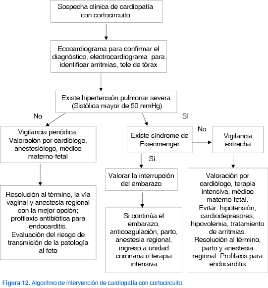 En la figura 12 se muestra el algoritmo de intervención diseñado para sospecha clínica de cardiopatía con cortocircuito durante el embarazo.