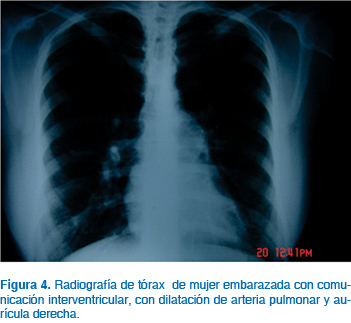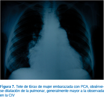 Los aspectos importantes a evaluar en pacientes embarazadas con este defecto y que determinarán la evolución clínica son: detectar presencia de arritmias atriales, grado de hipertensión arterial pulmonar, presencia de enfermedad vascular pulmonar obstructiva que se desarrolla por el sobreflujo a la circulación pulmonar condicionada por el corto de izquierda a derecha, presencia de embolismo paroxístico ya que el embarazo condiciona un estado hipercoagulable y puede incrementarse la frecuencia de estos eventos y presencia de insuficiencia del ventrículo derecho (Figuras 2 y 3).