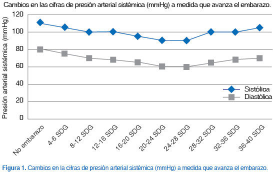 Es normal que en el embarazo y el parto se presenten modificaciones cardiovasculares; el aumento en el gasto cardiaco (GC) y el volumen sanguíneo (VS) permiten aportar al feto un flujo sanguíneo adecuado y preparar a la madre para la pérdida sanguínea en el momento de la resolución del embarazo (Cuadro I). 1,2 Por otra parte, durante la gestación ocurren cambios en la presión arterial a medida que avanza el embarazo (Figura 1). Estos cambios hemodinámicos determinan en la mujer embarazada una baja reserva cardiaca en el momento del parto y el puerperio inmediato, y esto, a su vez, condiciona, en algunas cardiopatías, una evolución tórpida del mismo embarazo, así como un empeoramiento en la cardiopatía de base, o bien desencadenan síntomas en aquellas pacientes cardiópatas no diagnosticadas, y al mismo tiempo pueden incrementar los resultados adversos perinatales.2,7,8 La incidencia de enfermedades cardiacas en el embarazo es de 0.1 a 4%, la mortalidad materna ha disminuido desde 1930 (6%) hasta la actualidad (0.5 a 2.7%). Es la causa más común de muerte materna no obstétrica. Las mujeres con embarazo y enfermedad cardiaca tienen alto riesgo de presentar falla cardiaca, arritmias y eventos vasculares cerebrales.3