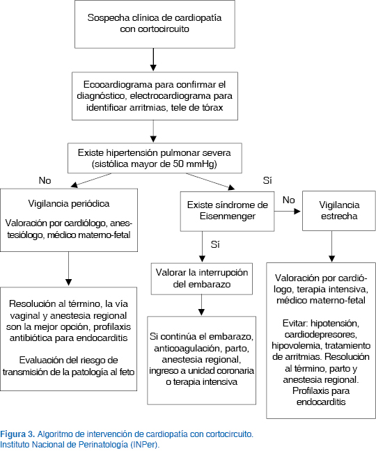 Las cardiopatías congénitas con cortocircuito tienen una frecuencia elevada en la población atendida en el Instituto Nacional de Perinatología por ser un centro de referencia nacional de embarazo de alto riesgo. En la actualidad se sigue un protocolo de diagnóstico y tratamiento para todas estas mujeres (Figura 3).11
