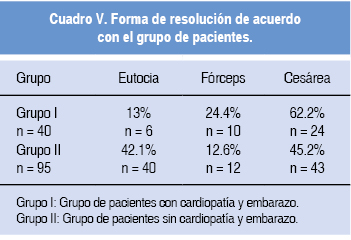 La proporción de mujeres en las que la vía de resolución fue eutócica es mayor en el grupo II que en el grupo I, así como también fue mayor la prevalencia de la resolución del embarazo con fórceps y cesárea en el grupo I que en el grupo II. En el 13% (n = 6) de las pacientes del grupo I, la vía de la resolución del embarazo fue eutócica; fórceps, 24.4% (n = 10); cesárea, 62.2% (n = 24). La forma de resolución para el grupo II en el 42.1% (n = 40) forma eutócica, 12.6% (n = 12) fórceps y 45.2% (n = 43) cesárea. En la relación entre el tipo de CCC y la forma de resolución del embarazo se obtuvo para la CIA 20% (n = 3) con eutocia, 33.3% (n = 4), fórceps; 46.7% (n = 6), cesárea; en el caso de CIV 18% (n = 3) eutocia; 18.8% (n = 3), fórceps y cesárea en el 62.5% (n = 8); para PCA 0% (n = 0) eutocia, 12.5% (n = 1), fórceps; 87.5% (n = 6), cesárea; en el caso de paciente con lesiones combinadas o mixtas 0% (n = 0) eutocias; fórceps, 33% (n = 2) y 66.7% (n = 4), cesárea (Cuadro V).