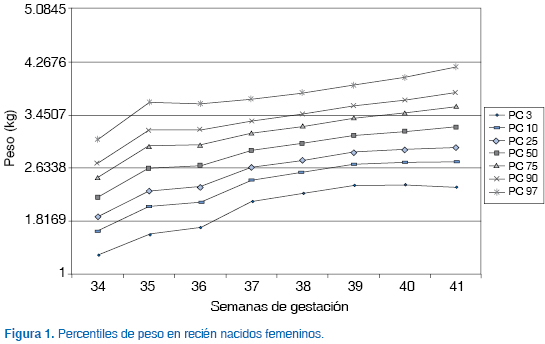 Las medidas antropométricas de los recién nacidos se concentraron para determinar los valores percentilares para el peso, la talla y el perímetro cefálico por sexo. Se construyeron curvas percentilares con los datos registrados mediante el programa Excel®.