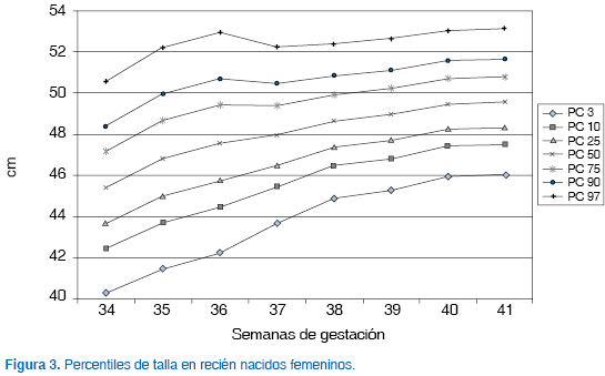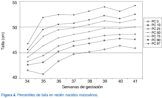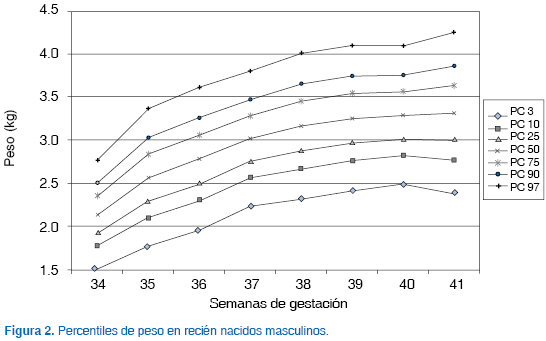 De los 2,252 recién nacidos estudiados, el 50.3% (n = 1,131) fueron del sexo masculino y 49.7% (n = 1,121) del sexo femenino. Se construyeron curvas para cada sexo.