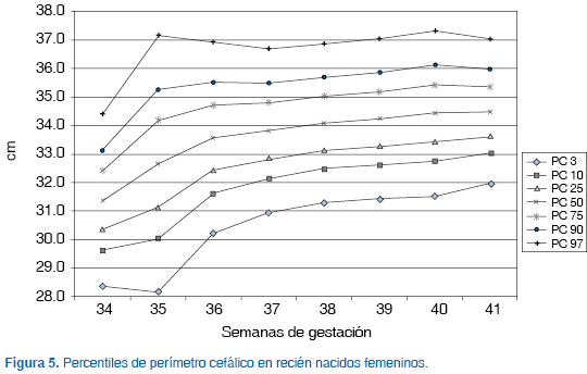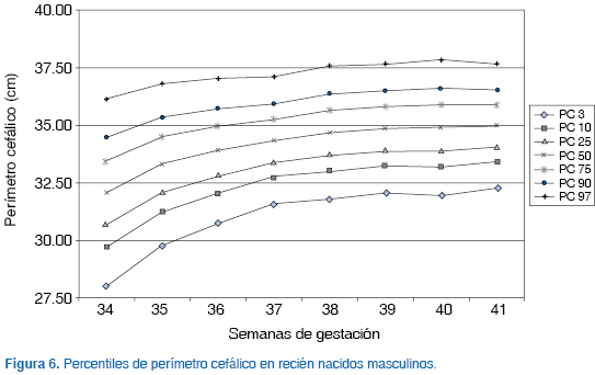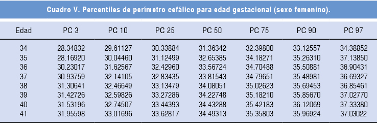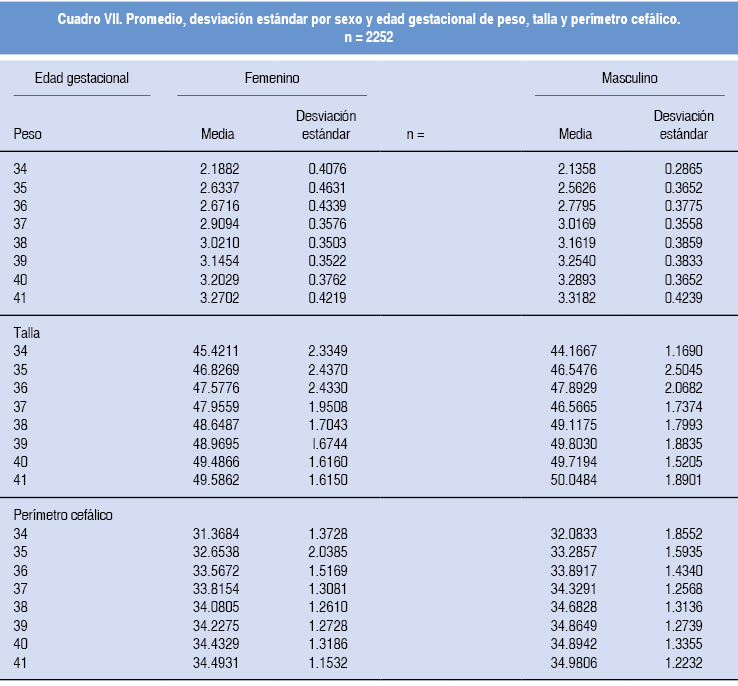 En el cuadro VII se presentan los promedios y desviaciones estándar de las variables del estudio. Con los datos recabados se construyeron cuadros y gráficas con los valores percentilares para cada sexo. A fin de contar con la información original, no se realizó "suavización" geométrica en los valores. Las curvas obtenidas permiten apreciar en general un incremento lineal de los diferentes parámetros somatométricos medidos en ambos sexos. En la curva de peso para el sexo femenino se observó mayor dispersión de los datos en la semana 35, pero únicamente en los percentiles tres y nueve. Para la longitud corporal en el sexo femenino hubo una mayor dispersión entre las semanas 34 a 36 de gestación, posteriormente se estabilizó la curva y se observó una disminución discreta del ritmo de crecimiento. Para el sexo masculino se encontraron curvas más regulares, excepto en los percentiles tres y nueve de la semana 35, donde también hubo dispersión. En el perímetro cefálico se observó mayor dispersión de los datos en la semana 35 para el sexo femenino.