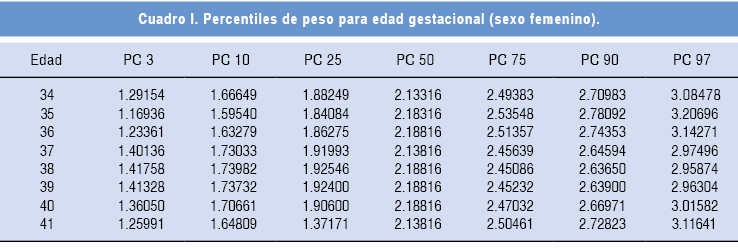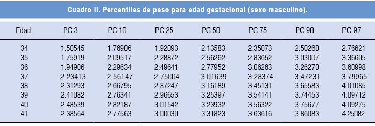 Se realizó un estudio prolectivo, con el análisis de 5,799 historias clínicas perinatales producto de 5,733 partos atendidos en el Hospital Torre Médica de la Ciudad de México del primero de enero de 1997 al 31 de diciembre del 2009. Se incluyeron 2,252 neonatos nacidos entre las 31 y 41 semanas de gestación, productos de gestaciones únicas, sanos y sin patología de la madre demostrable, como hipertensión, preeclampsia, eclampsia, enfermedad tiroidea, diabetes gestacional o malformaciones. Se excluyeron 502 casos por una fecha de última menstruación no confiable.