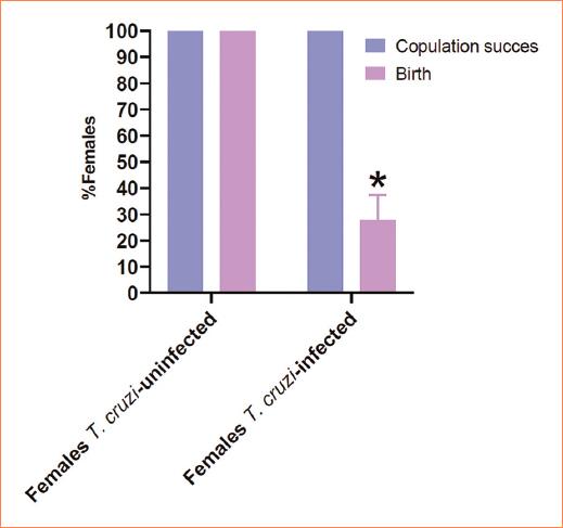 Figure 1 Copulation success. Mating plug (blue bar) was a 100% in all groups showing no statistical difference among groups, on the other hand, the birth (purple bar) was lower in Trypanosoma cruzi-infected females (p = 0.05).