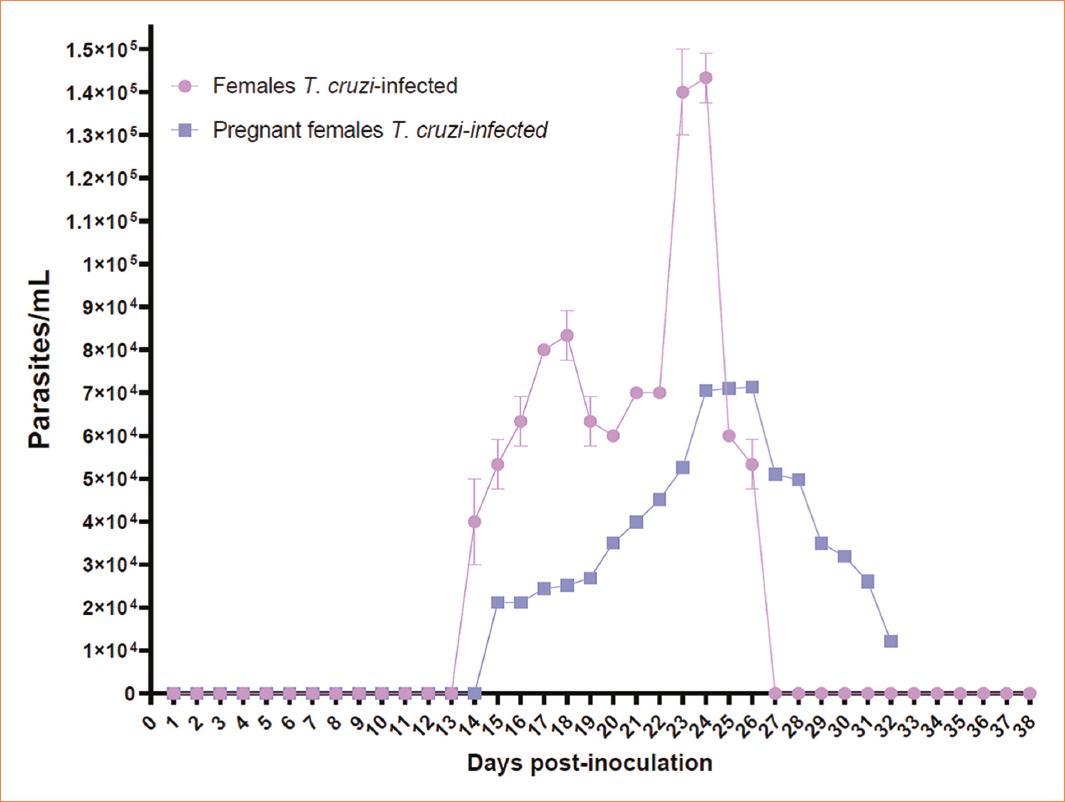 BALB/c healthy mice 20 20 ± 2 g. (around 6 weeks old) was provided the physiology facilities (Animal House, Department of Physiology, Biological Sciences National School, National Polytechnic Institute). All animals were maintained and treated strictly according to the NOM-062-ZOO-199913, and all the procedures and experimental protocols were performed according to the Biological Sciences National School Bioethics Committee. Two six female mice group were used, one was remains without pregnancy but intraperitoneally infected with 1 × 103 metacyclic trypomastigotes as control, and the second group with pregnancy (coming from the harem) was intraperitoneally infected with 1 × 103 metacyclic trypomastigotes. Parasitemia levels were determined in counting the parasite number in 5 μL of caudal vein mice blood using a Neubauer's chamber Brand' (Thermo Fisher Scientific, Waltham, Massachusetts, USA)14.