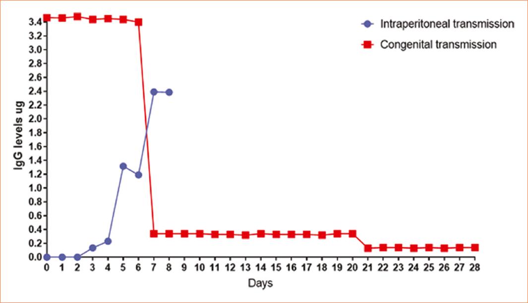 Figure 3 Immunoglobulinemia. The mouse pups infected intraperitoneally showed a gradual increase in antibodies against Trypanosoma cruzi. Reaching their maximum concentration on day 7 (2.4 μg), subsequently on day 8 these pups died due to the parasitic infection. Pups with congenital transmission showed the highest concentration of antibodies against T. cruzi from day 0 (3.4 μg), decreasing considerably on day 7 (0.4 μg), remaining constant for 13 days, a second decrease on day 21 (0.2 μg) remaining constant until day 28. Pups with congenital infection show a higher quantity of antibodies than those infected intraperitoneally (p = 0.05).