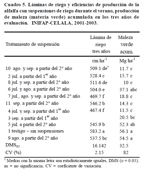 En cuanto al agua de riego aplicada, el testigo (sin suspensiones de riego) recibió una lámina estadísticamente superior a todos los tratamientos, 583.163 cm, en los tres años (Cuadro 5). El testigo se irrigó en 35 ocasiones, correspondiendo una lámina promedio de 17 cm. Los tratamientos con suspensiones recibieron una reducción en el número de riegos, igual a la reducción en el número de cortes. Los Tratamientos 10, 2 y 11 recibieron 13, 9 y 6% (74, 55 y 37 cm) menos lámina de riego que el testigo; este ahorro de agua puede llegar a representar un volumen anual del orden de 97, 73.2 y 49.2 x106 m3 año-1, respectivamente, en las 40 000 ha de alfalfa de la región (SAGARPA, 2005).