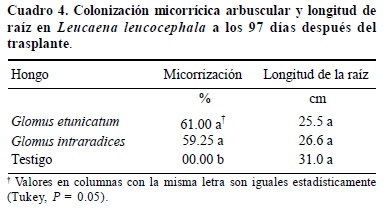 En el Cuadro 4 se muestran los valores de la micorrización al final del experimento, donde no se presentaron diferencias entre ambos hongos, así como para longitud radicular, incluyendo en este caso al testigo. Ahiabor e Hirata (1995), al estudiar un grupo de leguminosas, no observaron respuestas significativas en la longitud radical y, en cambio, se produjo una mayor cantidad de raíces delgadas, lo que coincide con los resultados observados en las plantas de leucaena micorrizadas en el presente experimento.
