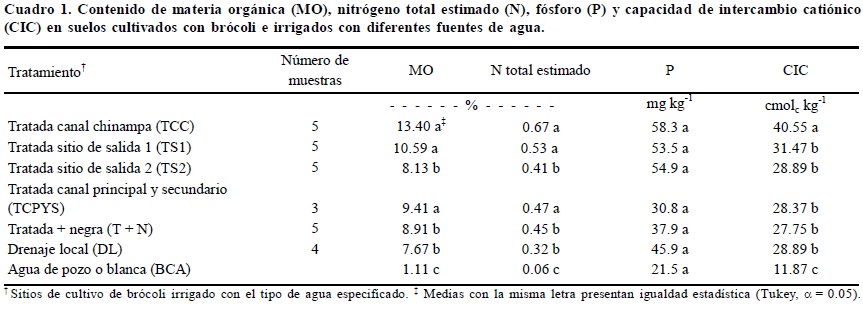 Los valores de MO, P, N y la CIC se presentan en el Cuadro 1. Destaca que la concentración de MO es alta, con valores que van de 7.67 hasta 13.4%, los cuales corresponden a los tratamientos DL y TCC, respectivamente. Tales valores pueden deberse a la práctica de aplicación de abono orgánico o de sedimentos de los canales (tierra amarilla) en el sitio donde va a ser cultivada la plántula de brócoli, práctica conocida localmente como mateado, la cual ha permitido evitar problemas con la salinidad del suelo y ha proporcionado nutrimentos al cultivo. El análisis estadístico para MO muestra diferencias significativas, presentándose tres grupos de medias: en el Grupo 1 con las mayores concentraciones de MO e igualdad estadística se ubican los Tratamientos 1, 3 y 4, que corresponden a sitios irrigados con: agua del TCC, agua tratada del Sitio de salida 1 y agua tratada de los canales principal y secundario, respectivamente; el Grupo 2 lo constituyen los Tratamientos 5, 2 y 6 que corresponden a parcelas irrigadas con agua tratada del Sitio de salida 2, tratada mezclada con agua negra o residual; y el tercer grupo corresponde a sitios irrigados con agua de drenaje local. El tratamiento testigo (sitio irrigado con agua de pozo o blanca) presentó la concentración de MO más baja constituyendo el tercer grupo de medias.