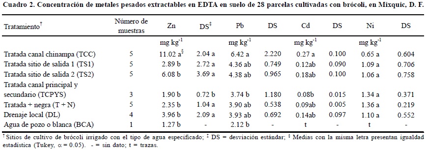 En el Cuadro 2 se muestran las concentraciones promedio de los metales analizados en las muestras de suelo. En orden de importancia, de acuerdo con las concentraciones encontradas, la secuencia fue Zn > Pb > Ni > Cd. Los valores de Zn más altos corresponden a los Tratamientos TCC y TS1, el resto de los tratamientos presentan valores muy similares debido, seguramente, a que el Zn puede provenir de las fuentes de agua, pero también influye la fertilización, sobre todo de tipo foliar, con micronutrimentos, que se emplea regularmente en el cultivo de romerito, segundo cultivo más importante en la zona. El Pb presenta una tendencia similar, sin embargo, además de la zona de chinampas, se incluye a los Tratamientos TS1 y TS2, correspondientes a las dos importantes salidas de agua tratada. El Cd y el Ni presentan valores similares entre los tratamientos, pero en todos los casos superiores al testigo. Los valores en los tratamientos fluctúan sin considerar al testigo para Zn, Pb, Ni y Cd de 1.90 a 11.02, de 3.74 a 6.42, de 0.65 a 1.36 y de 0.08 a 0.27 mg kg-1, respectivamente, y son en todos los casos superiores al testigo.