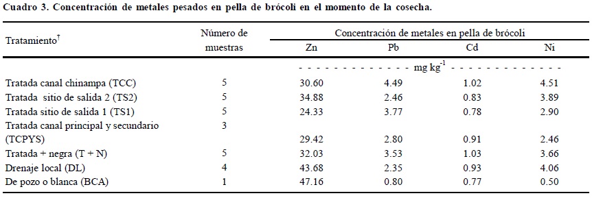 El contenido de Zn, Pb, Cd y Ni en pella de brócoli se muestra en el Cuadro 3. La secuencia en la cantidad de metales encontrada fue igual a la encontrada en el suelo: Zn > Pb > Ni > Cd, los valores fluctuaron, sin considerar al testigo, de 29.42 a 43.68, de 2.35 a 4.49, de 2.46 a 4.51 y de 0.78 a 1.03 mg kg-1, respectivamente.