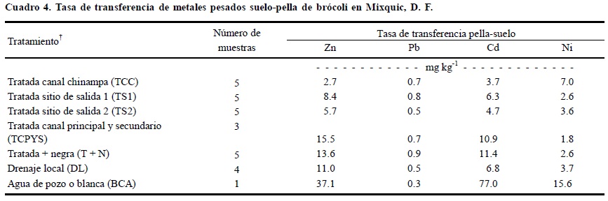 Las tasas de transferencia presentan variaciones de 3.7 a 11.4, de 2.7 a 15.5, de 1.8 a 7.0 y de 0.5 a 0.9 para Cd, Zn, Ni y Pb, respectivamente, sin considerar al testigo (Cuadro 4). Dichos valores son superiores a los factores de transferencia encontrados por Vázquez et al. (2005) para Cd, Ni y Pb, los cuales varían de 0.028 a 0.071, de 0.069 a 0.153 y de 0.110 a 0.305, respectivamente, para cultivos básicos (trigo, maíz, frijol y calabaza) en la zona del Valle del Mezquital en el estado de Hidalgo. Así mismo son superiores a los calculados por el mismo autor con datos de Kabata-Pendias y Pendias (1984), con la consideración de que la tasa de transferencia fue calculada en condiciones donde no se presentó antes contaminación del suelo por Cd, Ni y Pb.