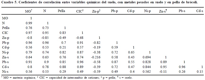 En el Cuadro 5 se presentan los resultados del análisis de correlación entre las diferentes variables evaluadas. Destaca el alto grado de asociación entre MO, N y CIC, con todas las variables evaluadas, a excepción de CIC vs. Ni en suelo y CIC vs. Zn en pella, las cuales no son significativas. La concentración de P se asocia con Pb y Ni en pella y con Zn, Pb y Cd en suelo. En general, se encontró correlación entre las propiedades químicas de los suelos con la concentración de metales en el suelo y en la pella de brócoli. Spiro y Stigliani (2003) mencionan que la concentración de MO, arcillas y carbonatos, y los procesos de los cuales ellos se derivan son las principales características que controlan los procesos para la retención y/o disponibilidad de los metales pesados en el suelo, razón por la cual se encuentran correlacionados.