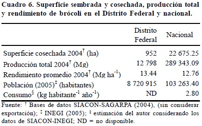 Cadmio, níquel y plomo. Con la finalidad de hacer una estimación del riesgo en la salud humana en relación con la acumulación de Cd, Ni y Pb, y el riesgo en la salud humana, se estimó el consumo per cápita de brócoli en México con base en datos de SIACON-SAGARPA (2004) e INEGI (2005) que corresponden a producción y población, respectivamente. El consumo per cápita estimado, sin considerar las exportaciones, fue de 2.8 kg año-1 (Cuadro 6).
