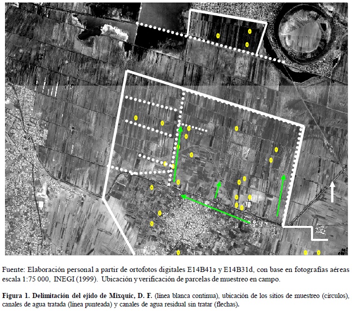 La actividad agrícola en Mixquic es importante desde el punto de vista económico y ecológico, genera recursos y empleo; los cultivos que destacan son: el brócoli (Brassica oleraceae) y el romerito (Suaeda difussa), sobre todo por la superficie cultivada. El primero, con producción de hasta 100 Mg d-1 en verano, representa cerca del 30% del brócoli que se distribuye en la Central de Abasto del Distrito Federal. El segundo es un producto endémico de la región, que se comercializa en dos épocas del año (semana santa y navidad) (INEGI, 1993). Ambas especies son irrigadas con agua tratada proveniente de la planta de tratamiento del Cerro de la Estrella, esta agua se mezcla en algunos sitios con aguas residuales sin tratar provenientes del Canal de Chalco y del drenaje local, lo que confiere ciertas limitaciones para su uso. La Dirección General de Construcción y Operación Hidráulica (DGCOH, 2000) reporta que dicha agua contiene Pb y Cr en concentraciones de 0.069 y 0.056 mg L-1, respectivamente, mientras que el Na se encuentra en 75.72 mg L-1, HCO3- y Cl- en concentraciones de 165.96 y 57.16 mg L-1, respectivamente, lo que, a largo plazo, puede constituir un problema de contaminación del suelo y de los productos agrícolas que se obtienen al regar con esa agua.