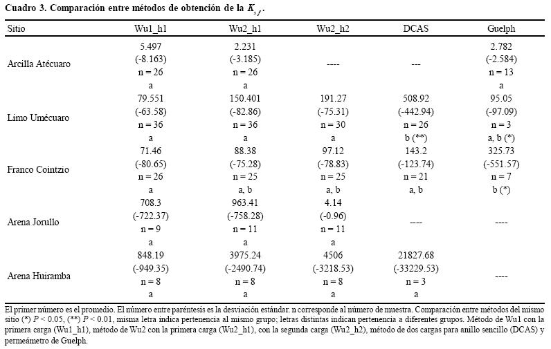 El método DCAS produjo los Ksf promedio más elevados (508.92 mm h1, limo Umécuaro). El permeámetro de Guelph presentó un valor extremo (1565.00 mm h1, suelo franco Cointzio) asociado a bioturbación por la presencia de tuzas. Para la arena Huiramba el valor promedio de Ksf fue de 21827.68 mm h1, el cual está influido por un dato extremo (60,182.42 mm h1) cuya causa se desconoce, pero puede estar asociada a la granulometría del material (arenas y gravas, presencia de capa gravosa debajo de las arenas).
