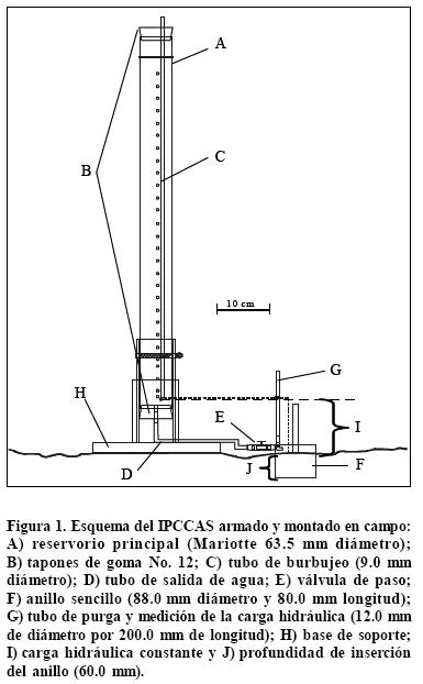 El dispositivo, similar al de Prieksat et al. (1992) difiere en que el anillo y el Mariotte están separados físicamente y sólo conectados por manguera flexible; esto facilita el proceso de recarga del Mariotte, sin afectar la inserción del anillo; la base permite fijar el IPCCAS con estacas en sitios con pendiente y el tubo de burbujeo permite ajustar la carga hidráulica deseada. La Figura 1 muestra el aspecto general del dispositivo ensamblado y montado para la medición en campo. El IPCCAS puede construirse con materiales de bajo costo, aproximadamente US $60.00.