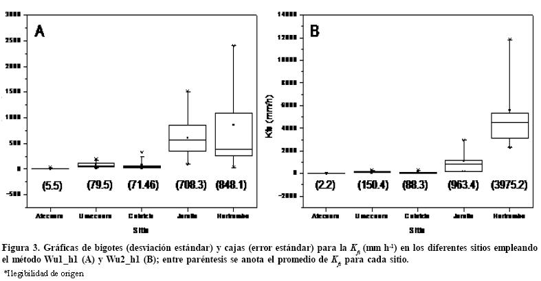 La Figura 3a muestra la distribución general de los valores de Ksf para cada sitio, la amplitud de valores para las arenas Jorullo y Huiramba, con promedios entre 708.3 y 848.19 mm h1, respectivamente. La dispersión es menor para el limo Umécuaro y el suelo franco Cointzio y muy reducida en la arcilla Atécuaro. Esta figura es similar a la Figura 3B, donde la arena Huiramba mantiene una dispersión semejante, y es menor en la arena Jorullo. En la Figura 3a la dispersión de los valores de Ksf para la arcilla Atécuaro, el limo Umécuaro y el suelo franco Cointzio son similares a los obtenidos con el IPCCAS con el método Wu2 (Figura 3b).