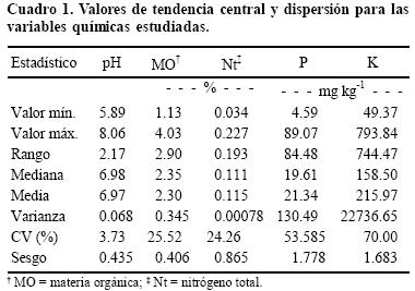 El estudio de la variabilidad espacial de pH, materia orgánica (MO), nitrógeno total (Nt), fósforo (P), y potasio (K) en el lote agrícola La Huerta, mostró que, a excepción del pH, estos elementos presentan una alta variabilidad. De acuerdo con el análisis de la estadística clásica se obtuvieron los siguientes valores medios, coeficiente de variación y número mínimo de muestras a tomar para obtener su valor medio con 95% de confianza (n): 6.97, 3.7% y 2 para pH; 2.3%, 25.5% y 103 para MO; 0.115%, 24.3% y 93 para Nt; 21.34 mg kg1, 53.6% y 451 para POlsen; 215.97 mg kg1, 70.0% y 768 para K.