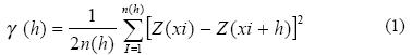 donde: Z(xi) = valor de la variable en el punto i; Z(xi+h) = valor de la variable en el punto xi + h; n(h) = número de veces que dos puntos distintos están separados por una misma distancia h (Burrough y McDonnell, 1998).
