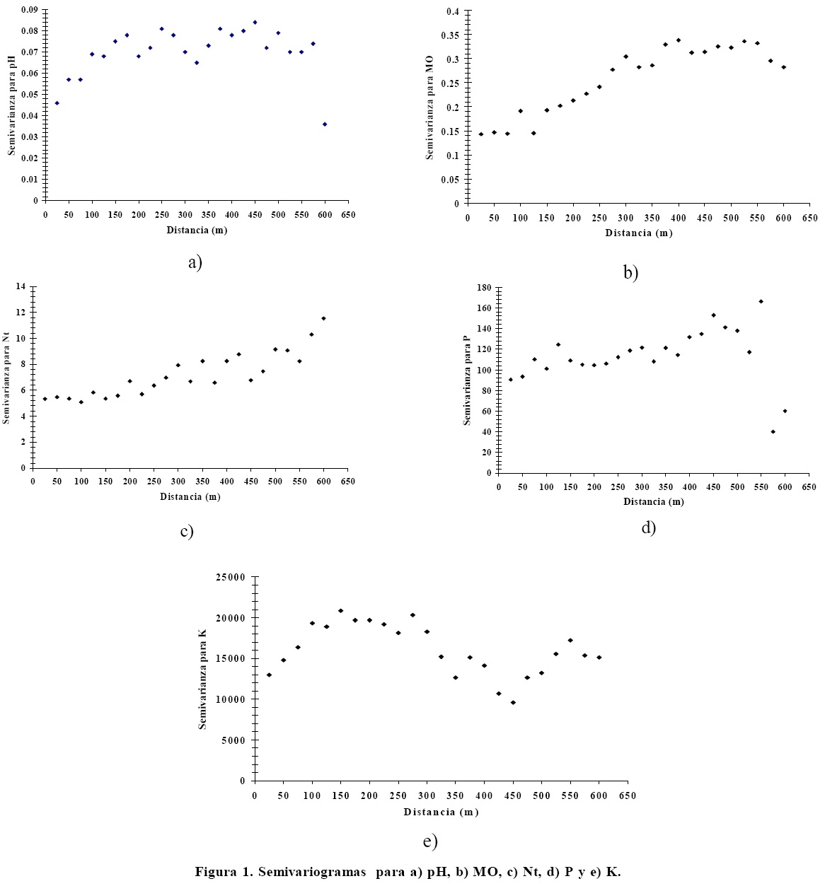 En la Figura 1 se muestran los semivariogramas experimentales obtenidos para cada una de las variables probadas, utilizando el enfoque de la geoestadística. En ella se puede observar que la semivarianza aumenta a medida que se incrementa la distancia y la semivarianza experimental se ajusta a los siguientes modelos teóricos; esférico, gaussiano, lineal, lineal y efecto de agujero (hole effect), para pH, MO, Nt, POlsen y K, respectivamente. Los resultados anteriores concuerdan con los de Shi et al. (2002) y Baxter et al. (2006), quienes estimaron la distribución de K, P y pH, y encontraron que los variogramas presentaban correlaciones espaciales; es decir, que la semivarianza se incrementa a medida que lo hace la distancia. Los estudios de distribución de POlsen en el suelo de Needelman et al. (2001) también mostraron que dicha variable estaba correlacionada. El Nt, por su parte, presenta correlación espacial, lo que coincide con Buscaglia y Varco (2003), Ruffo et al. (2005) y Peng et al. (2007). También Jiyan y Webster (1984) encontraron que las concentraciones de MO, Nt y POlsen se ajustaron al modelo lineal del semivariograma y el pH a un exponencial. Al utilizar el método de kriging, con los valores de los parámetros de los modelos teóricos del semivariograma, se obtuvieron las representaciones de distribución de las variables que se muestran en la Figura 2, utilizando el programa Surfer 8 (Golden Software, 2002).