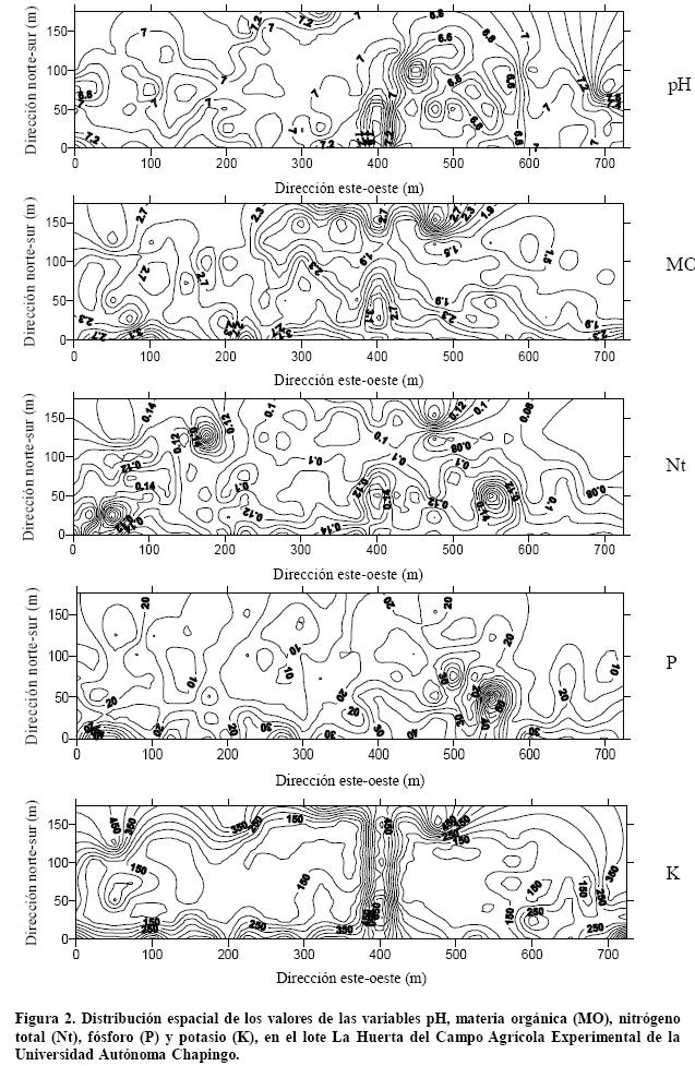 Si se observa la Figura 2, es posible ubicar dos zonas en cuanto a los patrones de variación del pH; una zona de menor variabilidad, que se encuentra desde 0 hasta 382 m, en la dirección esteoeste, y otra de mayor variabilidad, que se encuentra de 382 a 725 m, en la misma dirección, por lo que es recomendable considerar esta zonificación en el planteamiento y ubicación de tratamientos relacionados con el pH. En cuanto a la dirección de los patrones de mayor variación, ésta no se puede establecer con claridad, debido a que las isolíneas tienden a una forma circular. En relación con la distribución de la MO, se observan tres zonas de variabilidad: la primera, considerada de alta variabilidad, acotada por las coordenadas 050 m en la dirección nortesur y 0725 m en la dirección esteoeste, con patrones de mayor variación dependientes de la distancia en la dirección nortesur. Otra zona considerada de mayor variabilidad que la anterior, acotada por las coordenadas 125175 m, en la dirección nortesur, y 258582 m, en la dirección esteoeste, con patrones de variación en la dirección nortesur. Una zona de variabilidad baja o más homogénea, delimitada por las coordenadas 50125 m, en la dirección nortesur, y 0725 m, en la dirección esteoeste, con patrones de mayor variación en la dirección esteoeste.