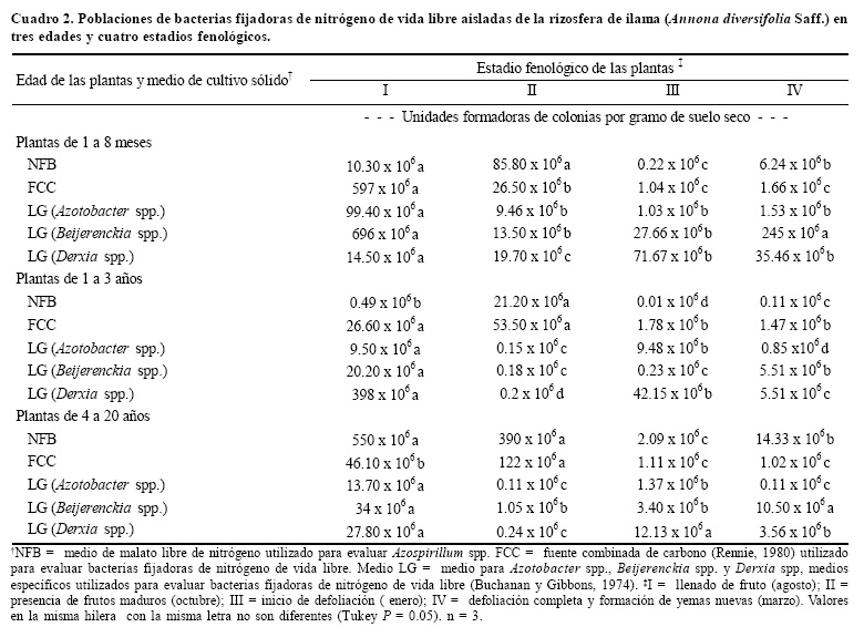 Se observaron variaciones en las UFC registradas en medios sólidos en los cuatro muestreos efectuados. En términos generales, se observaron dos tendencias: a) Las UFC de hongos totales y actinomicetes fueron más abundantes en la rizosfera de plantas defoliadas en la época de secas (marzo), independientemente de la edad de los árboles; por ejemplo, las UFC de actinomicetes registrados en el mes de marzo, considerando las tres edades de árboles, fueron conspicuamente superiores a las registradas en el mes de agosto (21 x 106 versus 13 x 106 UFC por g de suelo seco; n = 9; P = 0.05) y b) Las UFC de bacterias totales y bacterias solubilizadores de fosfatos (Cuadro 1) y las bacterias fijadoras de N de vida libre en general (Cuadro 2) fueron más abundantes en la rizosfera de plantas con hojas en época de mayor precipitación (agosto) comparadas con plantas parcialmente o totalmente defoliadas en las épocas de menor o nula precipitación. Por ejemplo, las UFC de bacterias en fuente combinada de carbono registradas en el mes de agosto, considerando las tres edades de árboles, fueron evidentemente superiores a las registradas en el mes de marzo (44 x 106 versus 14 x 105 UFC por g de suelo seco; n = 9; P = 0.05).