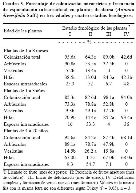 Adicionalmente, existió una evidente variación en la dinámica estacional de las estructuras micorrícicas estudiadas (Cuadro 3). En términos generales, las mayores colonizaciones micorrícicas totales se registraron en las épocas cuando las plantas tenían hojas y existió mayor precipitación (agosto y octubre). Independientemente de la edad de las plantas, los menores porcentajes de arbúsculos se presentaron siempre en plantas con defoliación completa en la época de sequía (marzo), mientras que los mayores porcentajes de dichas estructuras se registraron en las plantas con hojas en las épocas de mayor precipitación (agosto y octubre). Los mayores porcentajes de vesículas se observaron en la etapa previa a la defoliación y sequía (octubre). En el caso de las hifas, la mayor proporción se registró en las plantas defoliadas en épocas de sequía (enero y marzo).