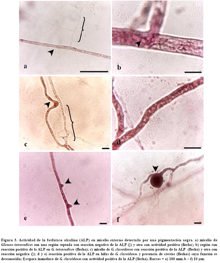 La actividad de ALP en el micelio fue positiva, tanto para G. claroideum (Figura 3d y f) como para G. intraradices (control positivo, Figura 3b), aunque también se observaron regiones de micelio con reacción negativa a la tinción (Figura 2a y c). De acuerdo con la tinción de ALP, el micelio externo de G. claroideum permaneció activo luego de tres meses en cultivo monoxénico. El micelio activo estuvo libre de septos, mientras que el tejido inactivo se caracterizó por estar septado. Las regiones hifales con mayor intensidad de la reacción positiva de la fosfatasa alcalina fueron aquellas cercanas a la raíz. Lo anterior se puede relacionar con el aprovechamiento del hongo de las fuentes de energía y nutrición provistas por la raíz, lo que permitió el desarrollo observado del micelio externo. No obstante, al aumentar la distancia hacia la raíz, es probable que el suministro de carbono para el hongo fuera limitado, lo que produjo la contracción del citoplasma y la generación de septos, como se ha reportado para Gigaspora rosea (Bago et al., 1998c).