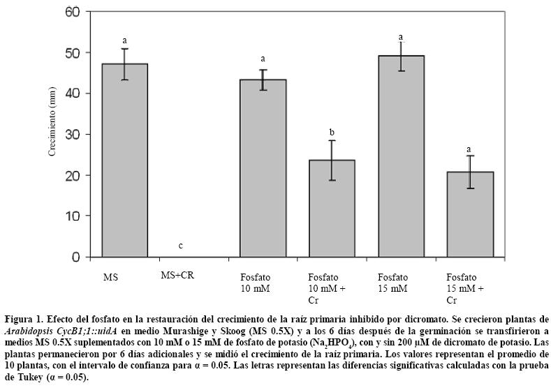 La adición de 10 y 15 mM de fosfato y sulfato al medio de crecimiento de las plantas que contiene dicromato 200 µM, permitió reestablecer el crecimiento de la raíz primaria. Estos resultados complementan los trabajos previos que sugieren que la entrada del dicromato a la raíz se realiza mediante los transportadores de sulfato y aportan información novedosa que sugiere como otra vía de entrada a los transportadores de fosfato.