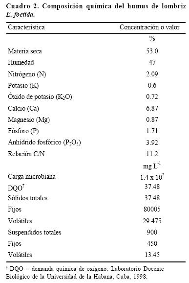 Los análisis mostrados en el Cuadro 2 corresponden a los resultados obtenidos con muestras de la vermicomposta procesada en la planta piloto de la Universidad de Guadalajara. Sin embargo, los análisis fueron realizados por Reinés en el año de 1998, en el laboratorio docente biológico de la Universidad de la Habana, Cuba (Reinés, 1998).