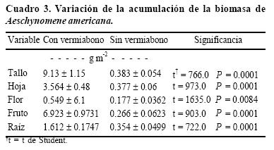 Los resultados de este estudio concuerdan con los reportados en hortalizas y gramíneas, los cuales revelan que los suelos pobres en nutrimentos tratados con vermiabono, influyen en la estimulación, formación y crecimiento de raíces y tallos y partes reproductivas (Bondia, 1994, Patil, 2000), ya que al final del ciclo de vida de A. americana (120 días), las plantas que se desarrollaron en las parcelas con vermiabono tuvieron mayor acumulación de biomasa en tallo, hoja, flor, fruto y raíz, lo cual es significativamente mayor que las de las parcelas sin vermiabono. Este efecto está relacionado con el uso de biofertilizante de lombriz, debido a que las raíces tienen a su disposición elementos nutritivos y sustancias producidas por la actividad microbiana para desarrollar un crecimiento integral de la planta (Yunusah, 1996).