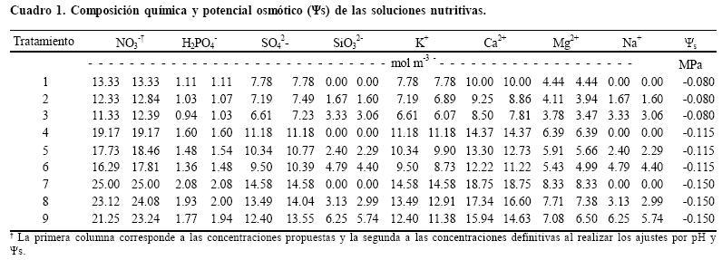 Los tratamientos consistieron en nueve SN (Cuadro 1), resultantes de la combinación de dos factores de estudio, ensayados a tres niveles cada uno: concentración de SiO32(0, 0.835 y 1.670 mol m3) y ψs de la SN (0.080, 0.115 y 0.150 MPa). Se utilizó un diseño factorial completo 32 con arreglo de tratamientos en el invernadero en diseño completamente al azar con cuatro repeticiones. Las SN se prepararon con sales grado reactivo y agua destilada y se formularon a partir de modificaciones a la solución universal de Steiner, de acuerdo a lo descrito por Parra et al. (2004). El pH de las SN con Si fue ajustado a 5.3±0.3 con una mezcla de ácidos (HNO3:H3PO4:H2SO4). Esta mezcla se valoró con Na2CO3, y se preparó en la proporción de 60: 5: 35, considerando los aportes (mmol L1) de NO3, H2PO4 y SO42, y se realizaron las correcciones necesarias para no exceder los ψs teóricos propuestos. En todas las SN, las concentraciones de los micronutrimentos fueron de: 5, 1.6, 0.023, 0.011 y 0.865 mg L1 de Fe, Mn, Zn, Cu y B; el Fe se proporcionó como FeEDTA. El aporte de silicio se hizo con una solución de metasilicato de sodio (Na2SiO3.9H2O), la cual fue valorada con ftalato ácido de potasio. Para evitar un estrés salino al momento del trasplante, las SN con ψs de 0.115 y 0.150 MPa fueron incrementadas gradualmente a partir de 0.080 MPa hasta alcanzar sus concentraciones definitivas en un periodo de siete días (31 días después de la siembra). Diariamente se repuso el agua evapotranspirada aforando a 5 L con agua destilada y se ajustó el pH a 5.3±0.3 con la mezcla de ácidos; las SN se renovaron cada 10 días. La planta de pepino se condujo a un tallo, para ello se podaron los brotes laterales; las ramas, hojas y frutos por debajo de los 40 cm fueron suprimidas. Las plantas se despuntaron a los 60 días después de la siembra eliminando todo el material vegetal por encima de 1.60 m para facilitar su manejo. Los cortes de frutos se realizaron a los 73, 77 y 82 días después de la siembra y la calidad del fruto se evaluó en el último corte considerando las características: porcentaje de materia seca del fruto (MSF), firmeza del fruto (FF), sólidos solubles totales (SST), acidez titulable (AT), conductividad eléctrica (CE) y pH. La MSF se determinó después de secar el fruto en la estufa a 70 °C durante 72 h; la firmeza del fruto con un penetrómetro Chatillan modelo PDV30 con puntal cónico de siete mm de diámetro, cuyas lecturas son en kilogramos fuerza a la deformación del fruto. Los sólidos solubles totales (°Brix) se midieron con el refractómetro digital Atargo N1, y para la determinación de la acidez titulable (% ácido oxálico), CE y pH se pesaron 10 g de pulpa de pepino sin cáscara a los cuales se les extrajo el jugo con un extractor de jugos. Al jugo extraído se le añadió 50 mL de agua destilada y en la mezcla se midieron directamente la CE y el pH con un Conductronic PC18; mientras que la acidez titulable se cuantificó titulando 10 mL de jugo con NaOH 0.01 N, para lo cual se utilizó fenolftaleína como indicador. Después del tercer corte de los frutos, las plantas se cosecharon separando en hojas superiores, hojas inferiores y tallos. Se consideró como hojas superiores a las ubicadas a una altura de 1 a 1.6 m; hojas inferiores a las ubicadas a una altura de 0.4 a 1 m. Este material vegetal se secó en la estufa con circulación forzada de aire a una temperatura de 70 ºC durante 72 h, se molió en un molino eléctrico, se pasó a través de un tamiz con malla 40 y se determinaron las concentraciones de Si, P, K, Ca, Mg, Na y Zn . El Si se cuantificó por el método de fusión con NaOH (Kilmer, 1965) modificado por Elliott y Snyder (1991), y el resto de los nutrimentos se determinó mediante una digestión húmeda, con una mezcla de HNO3 y HClO4 (Alcántar y Sandoval, 1999) y su cuantificación se realizó en un espectrofotómetro de emisión con plasma acoplado (ICPAES). El análisis de varianza de las variables de respuesta (calidad del fruto, concentración de Si en órganos vegetales, producción de materia seca total y concentración nutrimental en plantas de pepino) se realizó evaluando los factores principales del diseño factorial y la interacción de ambos. La comparación de medias de las interacciones significativas se hizo mediante la prueba de Tukey (α = 0.05). Estos análisis estadísticos se realizaron con el programa Statistical Analysis System, Versión 8 (SAS Institute, 1999).