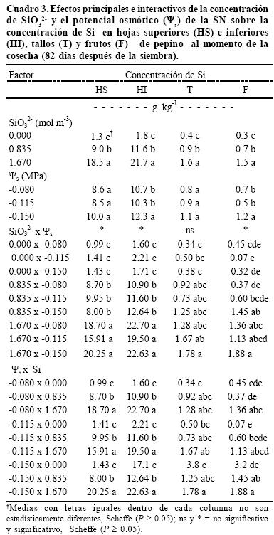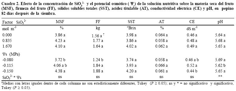 La concentración de silicio en las hojas superiores e inferiores, tallos y frutos se incrementó significativamente al aumentar la concentración de SiO32 en la solución nutritiva, sin repercutir en la calidad de los frutos. Con un potencial osmótico de 0.150 MPa en la solución nutritiva, la materia seca (4.38%) y la firmeza del fruto (1.88 kg fuerza) se incrementaron en forma significativa, 17.7 y 51.6% comparado con 0.080 MPa (3.72% y 1.24 kg fuerza respectivamente). La concentración de P, K y Ca en las hojas superiores de pepino disminuyeron cuando se suministró Si en las soluciones nutritivas con menor ψs (0.150 MPa). Se obtuvieron evidencias de que la concentración de Na de las hojas superiores fue consecuencia de la absorción mediante flujo de masas, de la concentración de Na en la solución nutritiva (el Na provino del metasilicato de Na aplicado como fuente de silicio); este efecto solamente se obtuvo con la solución nutritiva más diluida o con mayor potencial osmótico (0.080 MPa).
