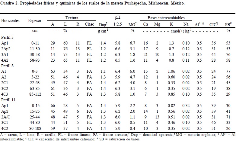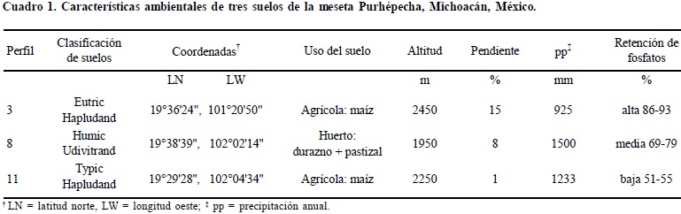 En la Meseta Purhépecha, los suelos de Ando se originan de ceniza volcánica (Aguilera, 1965). El uso potencial de estos suelos es de bosque (pino, pino-encino y encino-pino), el cual aún se conserva, sin embargo en extensas áreas se les ha cambiado este uso por el agrícola, principalmente de maíz, pastizales y huertos de frutales y de aguacate (Alcalá et al., 2001). Si bien, su potencial agrícola es alto, presentan deficiencias nutrimentales ocasionadas por la alta fijación de fósforo y toxicidad por Al que pueden inhibir la actividad microbiológica, razón por la cual se han realizado estudios en relación con la disponibilidad del fósforo con los métodos Olsen y Bray (Venegas et al., 1999). Aguilera (1965) reportó la presencia de alófano en Andisoles, al cual sólo asociaron con la RF, pero no lo cuantificaron.
