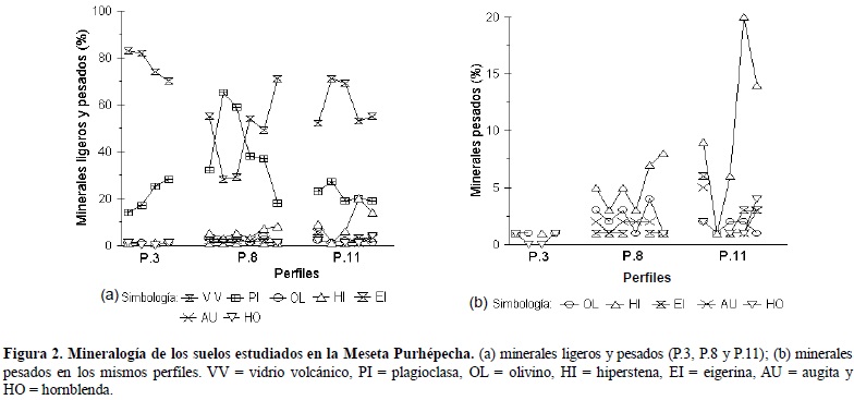 Los minerales primarios de los suelos de estudio se muestran en la Figura 2. Los minerales dominantes en los tres suelos son aluminosilicatados. El vidrio volcánico es abundante (25 a 83%) en comparación con las plagioclasas (14 a 65%) (Figura 2a). Los minerales ferromagnesianos (olivino, hiperstena, eigerina, augita y hornblenda) son poco abundantes (menores de 10%) en comparación con los aluminosilicatados (Figura 2b). El P.3 se caracterizó por la escasez de ferromagnesianos (principalmente piroxenos), los cuales son más abundantes en el P.8 y P.11. En el material de origen de estos suelos predomina la ceniza volcánica con dominancia de vidrio volcánico pardo básico. En el P.3 y P.11 las cenizas son basalto-andesíticas y en el P.8 basálticas. El carácter básico de los minerales en estos suelos explica en parte los valores de pH ligeramente ácidos.