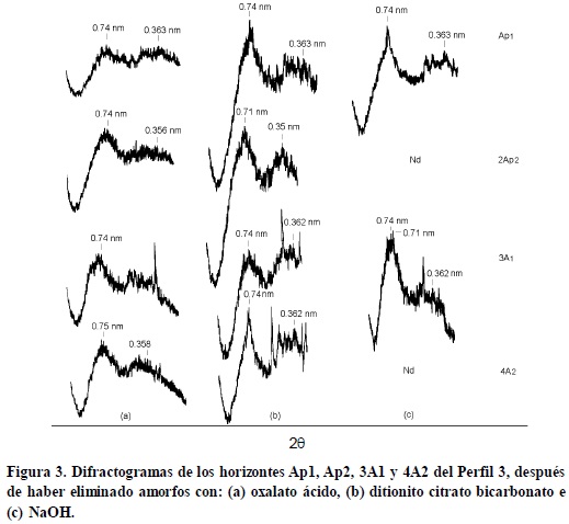 Difracción de rayos X combinada con disolución selectiva en la fracción arcillosa (< 2 μm). La DRX de la fracción fina del P.3 después de los lavados con OXA presentó una reflexión principal alrededor de 0.74 nm y 0.75 nm, y otra secundaria a 0.36 nm (Figura 3a) definidas mejor después del lavado con DCB (Figura 3b) e NaOH (Figura 3c). Estas reflexiones se asociaron a la presencia de una arcilla del tipo 1:1. Los difractogramas muestran la acción del OXA en la eliminación de los amorfos del tipo alófano como lo señalaron Mizota y Van Reeuwijk (1989). Aunque poco definidas, las reflexiones son más visibles que antes del lavado con este reactivo. Sin embargo, el tratamiento DCB permitió obtener las reflexiones a 0.74 nm, 0.71 nm y 0.36 nm mejor definidas; ésto indica que dicho reactivo fue más efectivo en la eliminación de amorfos, lo cual corrobora la presencia de óxidos e hidróxidos de Fe en el P.3.