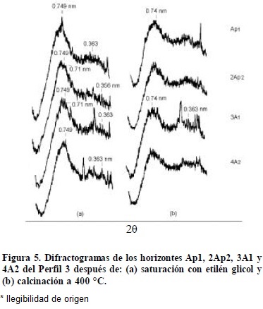 Los difractogramas de los horizontes del P.3 que después del tratamiento con NaOH presentaron reflexiones a 0.74 nm y 0.36 nm (Figura 3c) permanecieron en la misma posición después de la saturación con etilén glicol. Con este tratamiento no se mejoró su definición, la reflexión a 0.71 en el horizonte 2Ap2 disminuyó, pero apareció una reflexión a 0.74 nm en este horizonte y otra a 0.71 en el horizonte 3A1 mal definidas (Figura 5a). Lo anterior indica que no hubo expansión de las láminas de arcillas, confirmando la presencia de arcillas 1:1. Posteriormente a la calcinación a 400°C, desaparecieron todas las reflexiones que se presentaron después de la saturación con etilén glicol (Figura 5b); lo que comprueba la presencia de arcillas 1:1, las cuales se desintegran a esa temperatura. El comportamiento de las arcillas del P.3 denota la presencia de haloysita parcialmente deshidratada. La haloysita se origina por la alteración de plagioclasas y de la meteorización de cenizas volcánicas que, una estación seca, favorece su cristalización a partir de materiales amorfos (Porta et al., 2003). Las condiciones de formación para la haloysita son favorables en el P.3 de estudio al presentar un alto contenido de plagioclasas y materiales amorfos (Figura 2a; Cuadro 3), y una estación seca con precipitación anual de 925 mm. Cabe mencionar que el régimen de humedad údico del P.3 se encuentra entre el límite entre de los regímenes de humedad údico y ústico (Alcalá et al., 2001).
