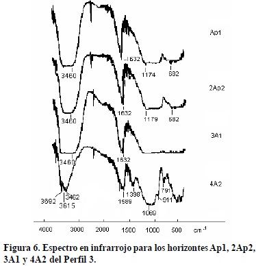 Espectroscopia infrarroja (IR). La presencia de minerales amorfos se corroboró por IR (Figura 6). Los espectros de los horizontes Api, 2Ap2 y 3A1 mostraron semejanzas con los del alófano e imogolita, a juzgar por las bandas anchas relacionadas con las vibraciones de los OH entre 2800 cm-1 y 3700 cm-1, y a la de los grupos Si-O, Si-O-Al y OH-Al entre 800 cm-1 y 1200 cm-1, Van der Marel y Beultelspacher (1976) corroboraron la alta hidratación y desorden de estos compuestos. El IR también confirmó la presencia de sílice en el horizonte 4A2, en el cual se observa la banda a 791 cm-1 cercana a 800 cm-1 correspondiente a la vibración Si-O, ésta se asoció al ópalo, el cual es frecuente en presencia de alófano rico en sílice en su primer estado de alteración. La forma de las bandas en el horizonte 4A2 del P.3, mostró la incipiente formación de arcillas silicatadas cristalinas. La banda a 3692 cm-1 correspondió a las vibraciones (stretching) de los OH-Al externos de la capa octaédrica de los filosilicatos, las cuales se ubicaron entre 3700 y 3500 cm-1, en tanto que la de 3615 cm-1, muy poco visible se asoció a los OH-Al internos de las arcillas 1:1, estas bandas aparecieron de igual tamaño, como se ha reportado para la haloysita (Van der Marel y Beultelspacher, 1976). La banda a 911 cm-1 se asoció a las bandas de vibración bending de los OH-Al de los filosilicatos de las arcillas 1:1, los cuales aparecen entre 910 y 920 cm-1.