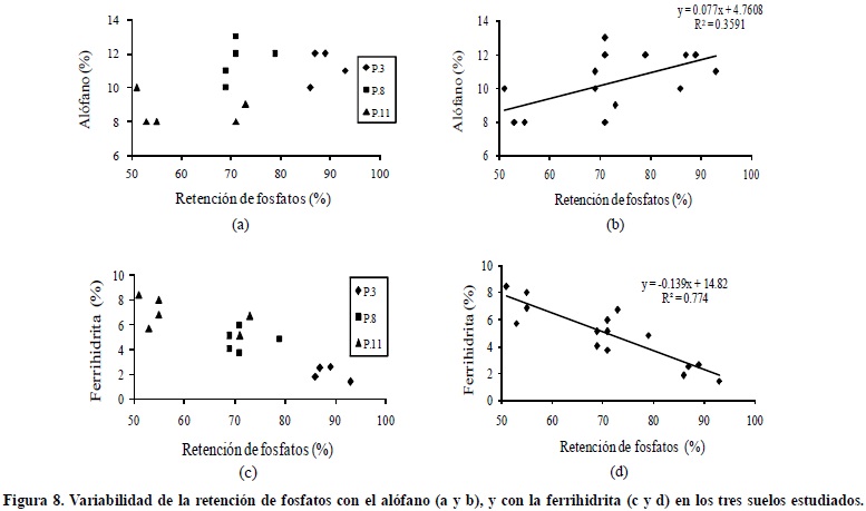 A mayor cantidad de FER, la RF tiende a disminuir como es el caso del P.11 (Figura 8c). En el P.3 cuyo porcentaje de RF es muy alto (86 a 93%) la cantidad de FER se redujo hasta 1.4%. Un comportamiento intermedio correspondió al P.8. Una mayor correlación (R2 = 0.7742) se obtuvo entre la FER y la RF (Figura 8d) con respecto a la obtenida para el ALO, lo que sugirió una débil participación de este mineral en la RF en los Andisoles estudiados. Este resultado concuerda con lo señalado por Borggaard (1983) en relación con la importancia de los óxidos de hierro en la RF.