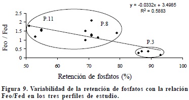 Se observa que la correlación entre Feo/Fed y RF no fue muy alta (R2 = 0.5894), sin embargo, existe una tendencia marcada hacia una mayor RF a valores menores de la relación Feo/Fed (Figura 9). Lo anterior indicó que el Fe extraído con DCB se asoció a la presencia de minerales de Fe cristalino, lo cual explicaría la alta RF en el P.3. Otros autores como Borggaard (1983) y Sei et al. (2002) indican la influencia de óxidos de Fe tanto amorfos como cristalinos en la RF al igual que el alófano (Shoji y Fujiwara, 1984).