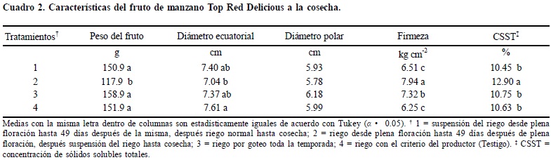 Cuando el riego se aplicó desde PF hasta los 49 días y después se suspendió por el resto del ciclo, se redujo significativamente el peso medio del fruto en comparación con el resto de los tratamientos de riego (Cuadro 2). Esta respuesta se debió no sólo a la falta de riego, sino también al retraso de la época de lluvia, la cual generalmente inicia en la tercera semana de junio y en este caso se presentó hasta la tercera semana de julio. No obstante que este tratamiento produjo los frutos más pequeños, la firmeza y la concentración de sólidos solubles totales de los frutos se mejoró. Esta información coincide con la de Hamlin et al. (1999), al indicar que al aplicar un DRC en forma eficiente, no se afecta el rendimiento, pero si la calidad de la fruta.