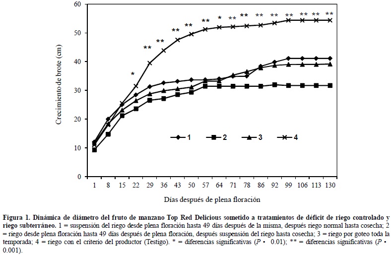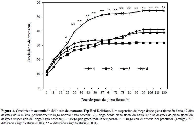 El crecimiento del brote es altamente sensible a un déficit hídrico y se observa una reducción donde se aplica el DRC (Behboudian y Mills, 1997). Lo anterior se corroboró en este experimento, donde el riego con el criterio del productor indujo un crecimiento promedio acumulado de brotes significativamente mayor en comparación con los tratamientos de riego subterráneo y con el DRC (Figura 2). El incremento vegetativo inducido con el riego del productor obliga a realizar podas de verano para permitir la penetración de luz a través del dosel y así mejorar la coloración del fruto. Además, esta actividad incrementa los costos de producción, dado que se obtuvieron 1269, 938, 875 y 1570 kg ha-1 de ramas producto de la poda respectivamente, en los diferentes tratamientos aplicados. Estos costos de poda pueden ser obviados con la aplicación del DRC y el riego subterráneo, similar a lo encontrado por Neilsen et al. (1999), Traore y Maranville (1999) y Romero et al. (2004a).
