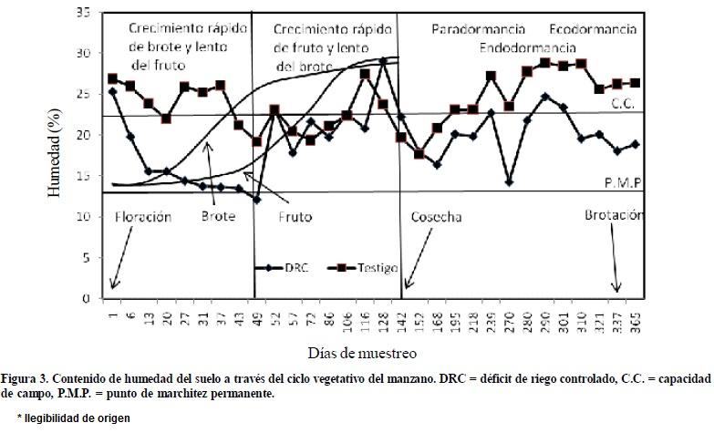 El uso del déficit de riego controlado (DRC), déficit hídrico regulado o riego deficitario planificado, fue propuesto por primera vez por Chalmers et al. (1981) trabajando con durazno en Australia. Esta estrategia consiste en disminuir o eliminar la cantidad de agua aplicada al árbol, en una etapa fenológica específica del mismo, sin afectar significativamente la producción y la calidad del fruto. Naor et al. (1999) indican que cuando el DRC es bien aplicado no hay reducción en el rendimiento y la calidad del fruto se conserva o se mejora. Parra et al. (2005) indican que en manzano, el brote crece rápidamente al inicio de la estación y cuando éste disminuye su tasa de crecimiento, el fruto que ha crecido lentamente durante el mismo periodo, aumenta su tasa de crecimiento rápidamente; de esta manera, un DRC al inicio de la temporada reduce el crecimiento del brote sin afectar fuertemente el crecimiento del fruto. Sin embargo, algunos investigadores (Kilili et al., 1996; Mpelasoka et al., 2001 y Leib et al., 2006) indican que el DRC disminuye el tamaño del fruto y el rendimiento, pero mejora su calidad al incrementar la concentración de sólidos solubles, la materia seca y la firmeza.